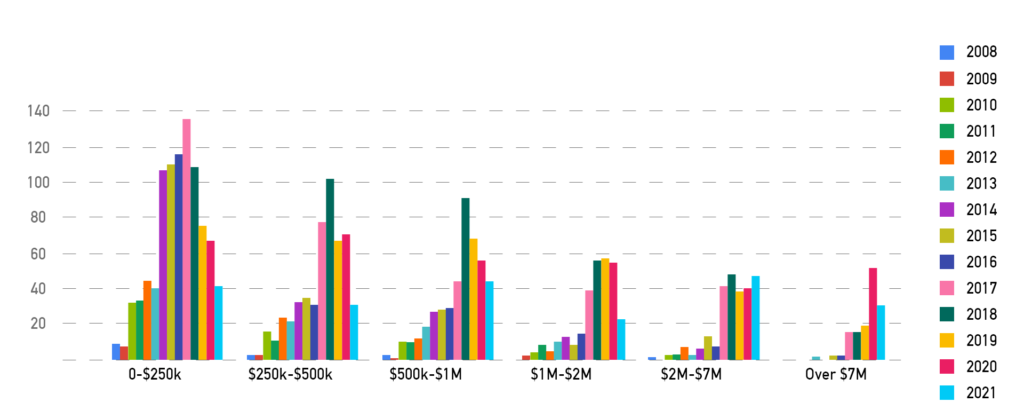 This graph represents a snapshot of the total data. It will give you a better understanding of where your business sits in comparison to all the businesses analyzed. The sum of transactions between 2008 and 2021 is over $4 billion. We believe this represents only 10-15% of the overall market of traded web businesses. The rest are either partner buyouts, employee buyouts or private transactions.